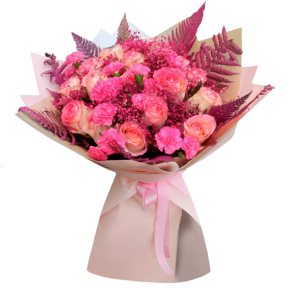 Роза одноголовая розовая, гвоздика мини розовая, папоротник, сухоцвет. Упаковка (лента, пленка, крафт, сетка, пленка матовая)