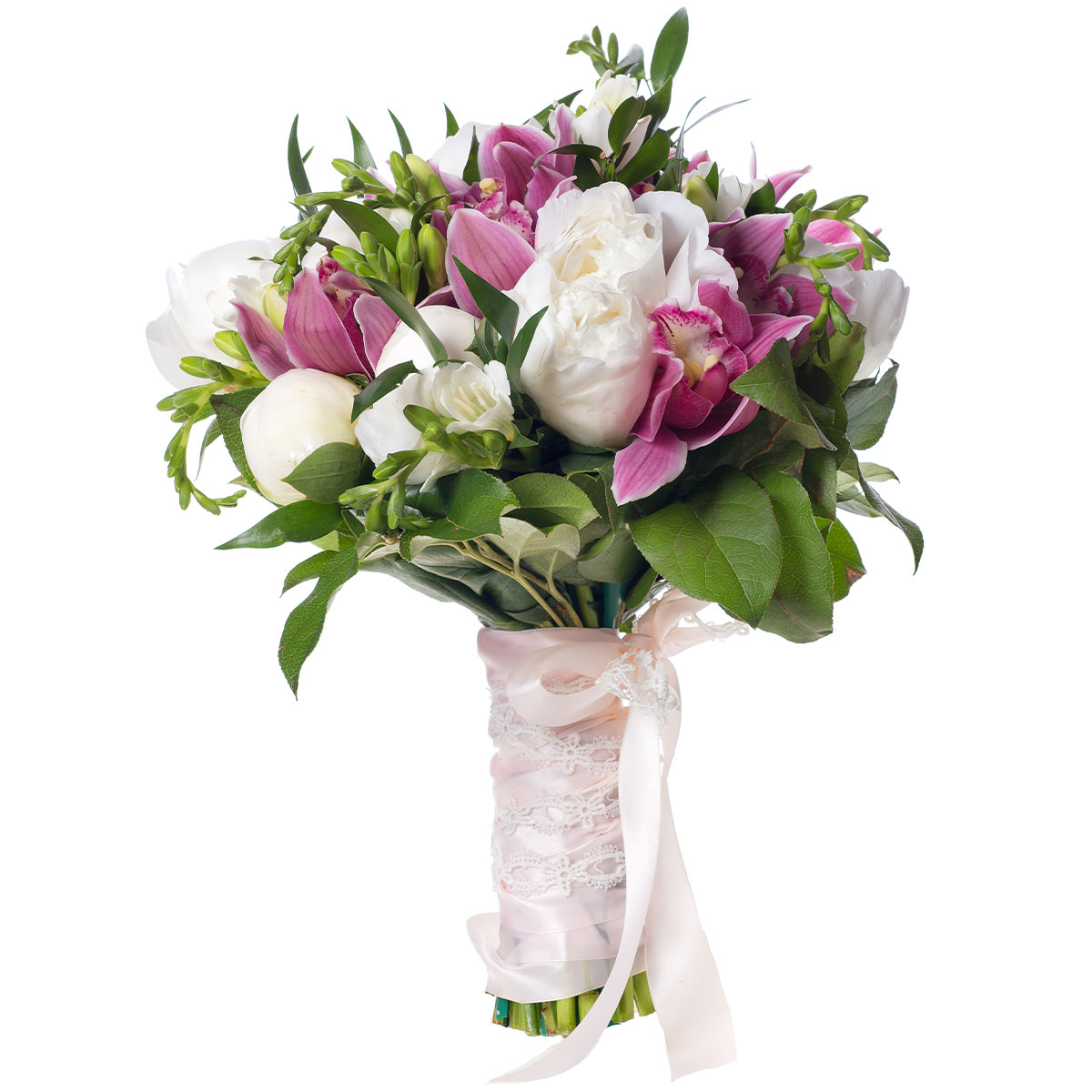 Пион белый, орхидея розовая, фрезия белая, зелень. Упаковка (лента, пленка, крафт, сетка, пленка матовая)