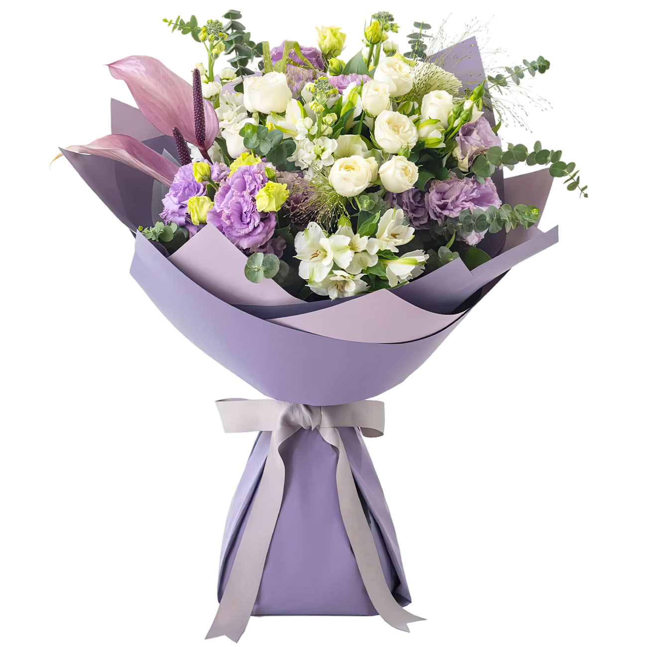 Эустома сиреневая, антуриум сиреневый, роза кустовая белая кенийская, альстромерия белая, маттиола белая, пеннисетум (фонтанный колос). Упаковка (лента, пленка, крафт, сетка, пленка матовая)