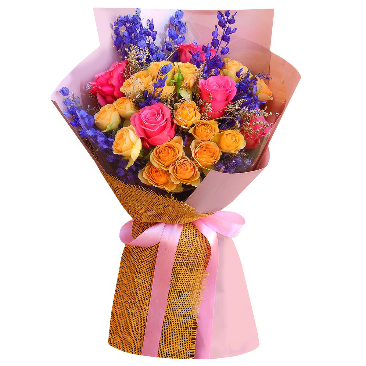 Роза одноголовая розовая, роза кустовая жёлтая, сухоцветы, лунария синяя. Упаковка (лента, пленка, крафт, сетка, пленка матовая)