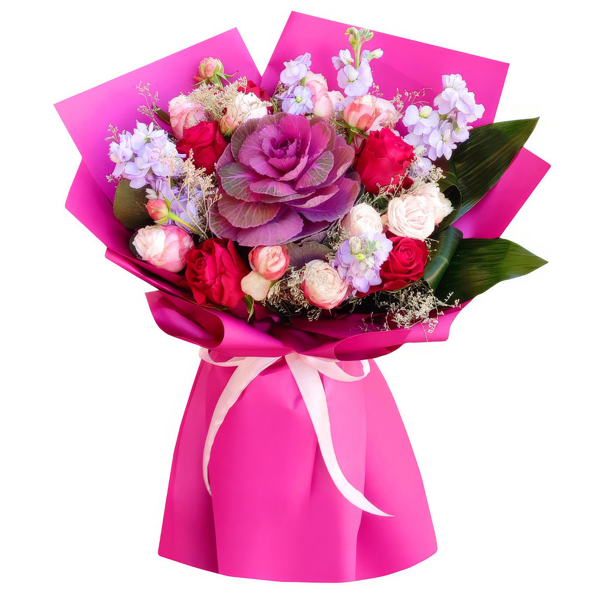 Брассика, роза кустовая белая, роза одноголовая розовая, маттиола сиреневая, аспидистра. Упаковка (лента, пленка, крафт, сетка, пленка матовая)