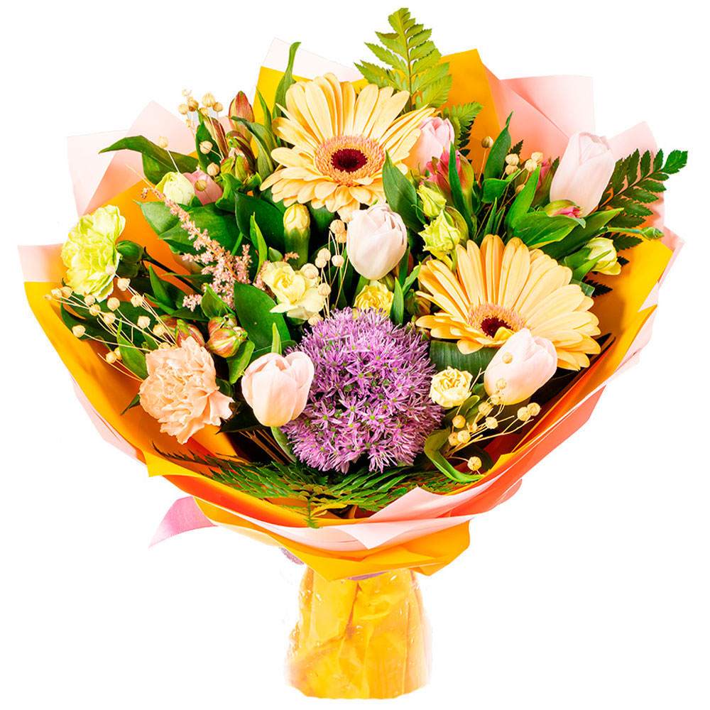 Гербера желтая, гвоздика кремовая и желтая, альстромерия розовая, папоротник, тюльпан нежно-розовый, экзотическая зелень. Упаковка (лента, пленка, крафт, сетка, пленка матовая)