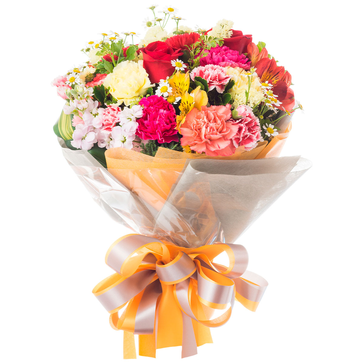 Роза одноголовая красная, гвоздика розовая и кремовая, альстромерия желтая и крансая, маттиола розовая, ромашка. Упаковка (лента, пленка, крафт, сетка, пленка матовая)