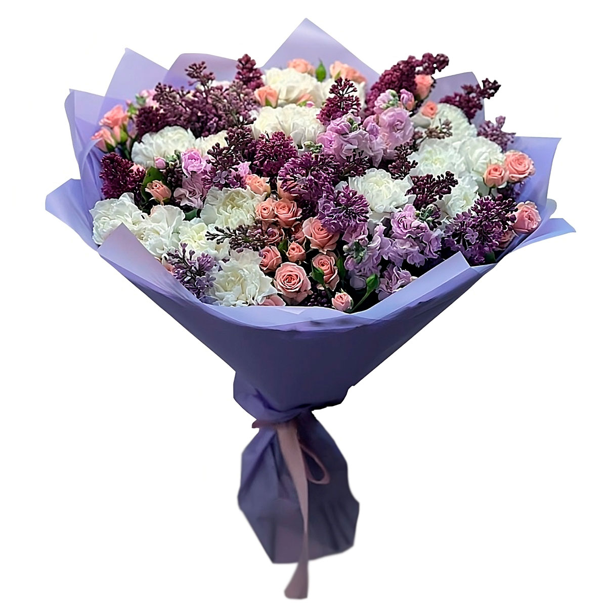 Сирень, маттиола сиреневая, роза кустовая розовая, гвоздика белая. Упаковка (лента, пленка, крафт, сетка, пленка матовая)
