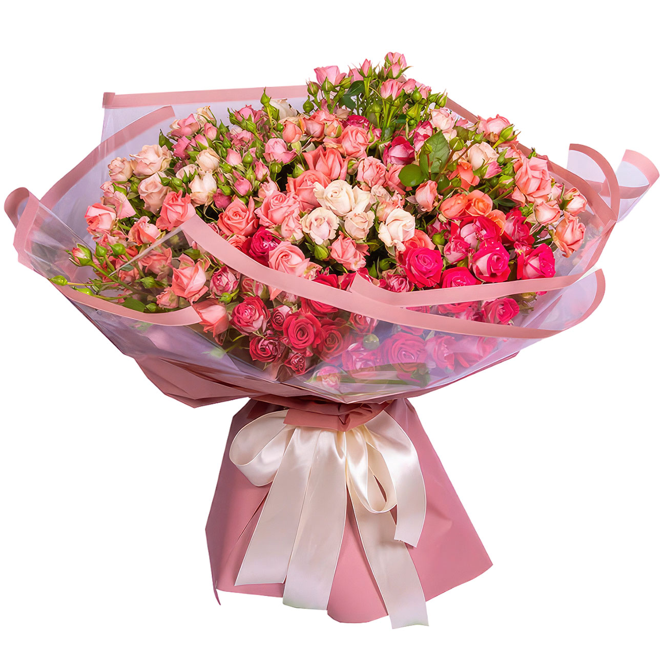 Роза кустовая микс (белая и розовая). Упаковка (лента, пленка, крафт, сетка, пленка матовая)