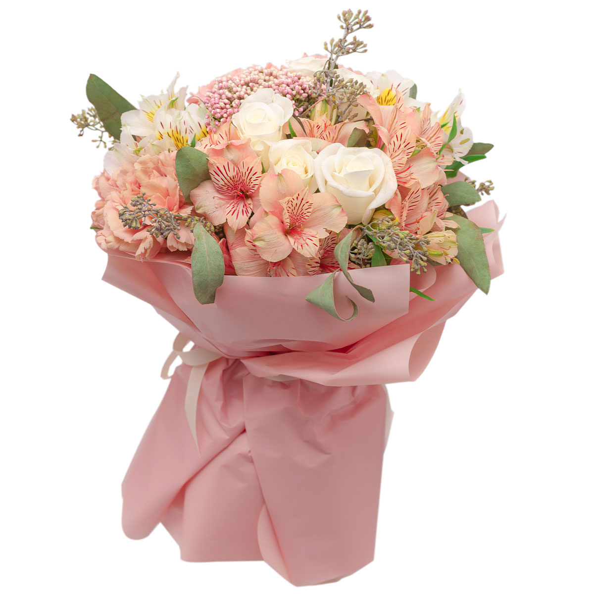 Роза одноголовая белая, альстромерия белая и розовая, озотамнус, эвкалипт. Упаковка (лента, пленка, крафт, сетка, пленка матовая)