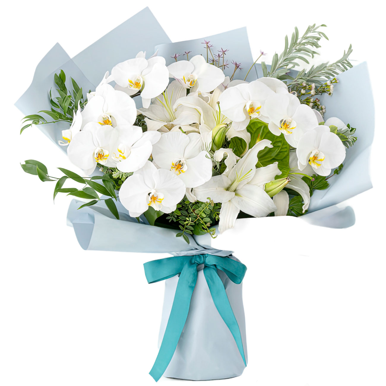 Орхидея белая «Бабочка», лилия белая, ваксфлауэр, зелень. Упаковка (лента, пленка, крафт, сетка, пленка матовая)