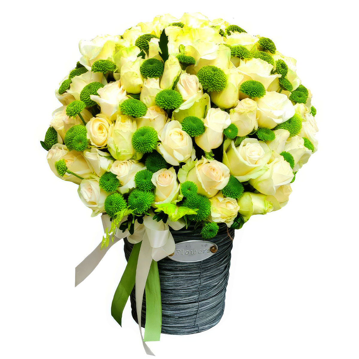 Роза одноголовая белая, хризантема кустовая зеленая. Упаковка (Корзина, оазис, ящик).