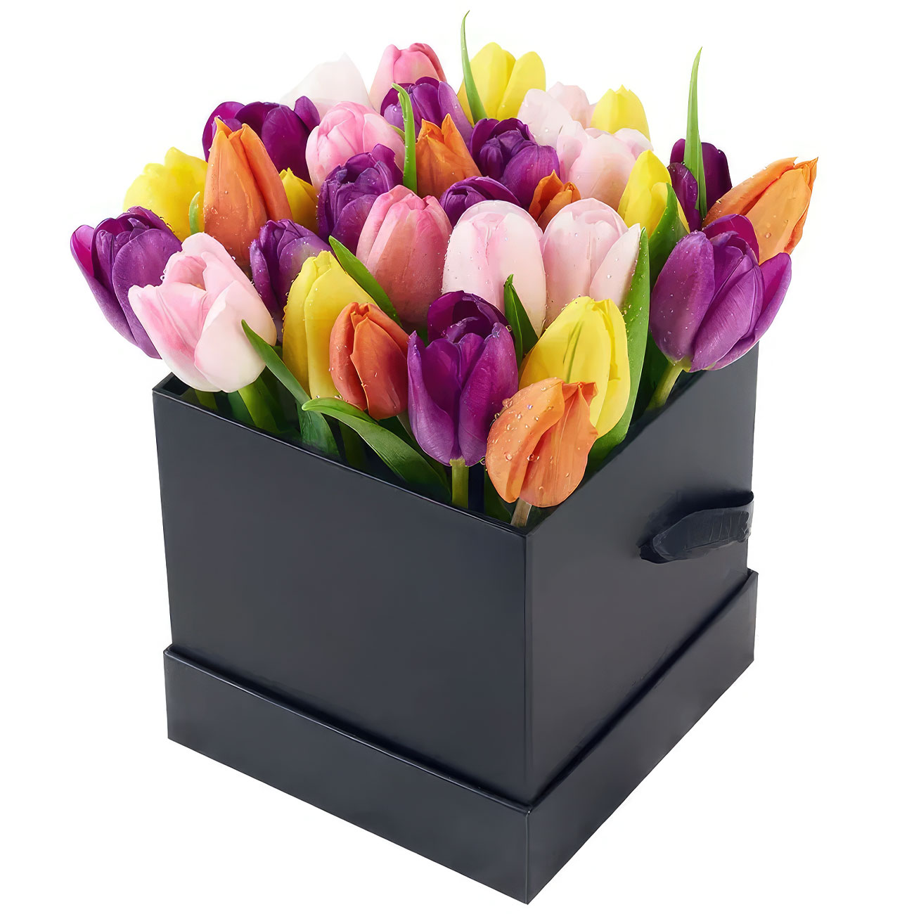 Тюльпаны микс (жёлтый, оранжевый, сиреневый, розовый). Упаковка (шляпная коробка, квадратный бокс, коробка сердце, оазис)
