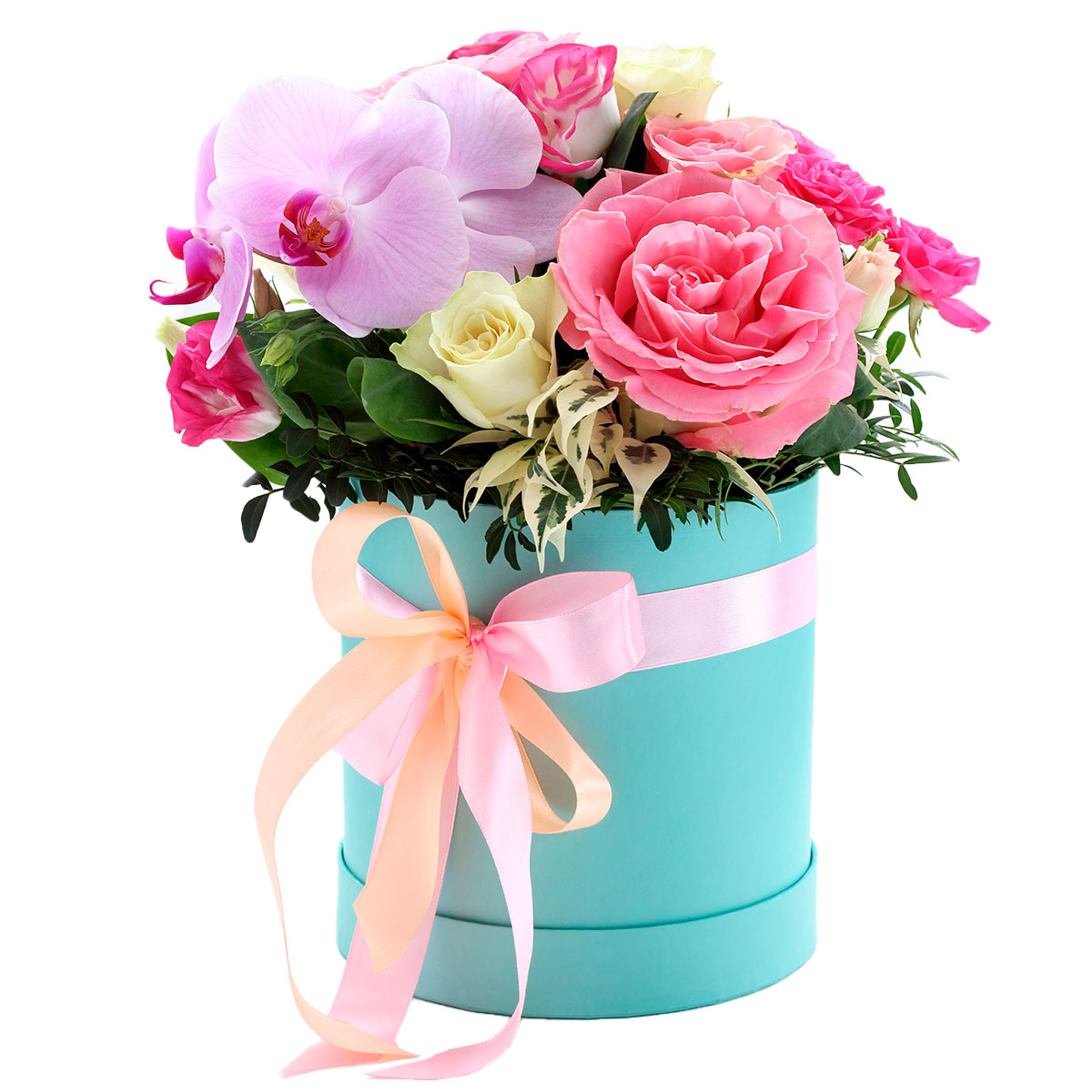 Орхидея розовая, роза одноголовая розовая, роза кустовая кремовая и розовая, зелень. Упаковка (шляпная коробка, квадратный бокс, коробка сердце, оазис)