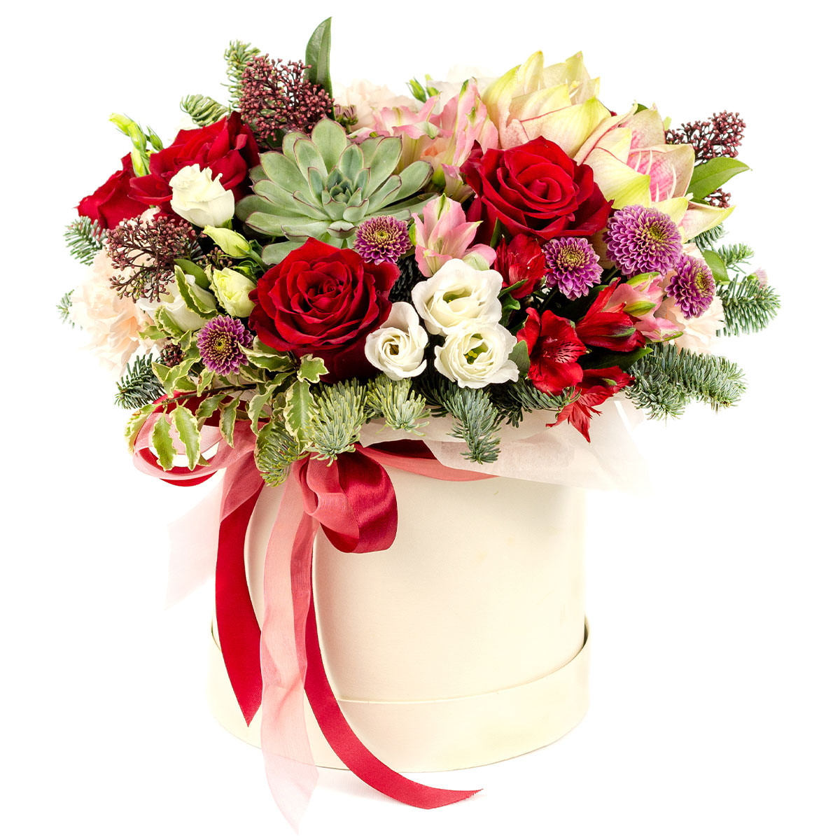 Роза одноголовая красная, суккулент, эустома белая, альстромерия розовая и красная, хризантема кустовая сиреневая, амариллис, гвоздика нежно розовая, хвоя, скиммия, нобилис. Упаковка (шляпная коробка, квадратный бокс, коробка сердце, оазис)